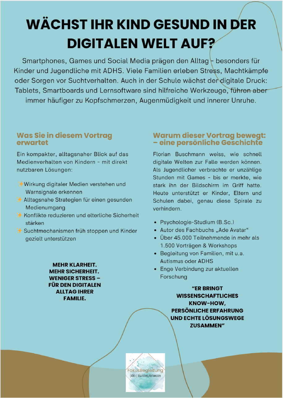 Smartphones, Games und soziale Medien gehören heute selbstverständlich zum Alltag von Kindern und Jugendlichen. Sie bieten Unterhaltung, Austausch und Informationen, stellen Familien jedoch zugleich vor wachsende Herausforderungen. Besonders bei Kindern mit ADHS können digitale Medien eine starke Anziehungskraft entfalten. Viele Eltern erleben wiederkehrende Diskussionen rund um das Handy, eine zunehmende Reizüberflutung, Sorgen wegen steigender Bildschirmzeiten oder den Eindruck, dass schulische Anforderungen und digitale Medien gemeinsam immer mehr Druck erzeugen.