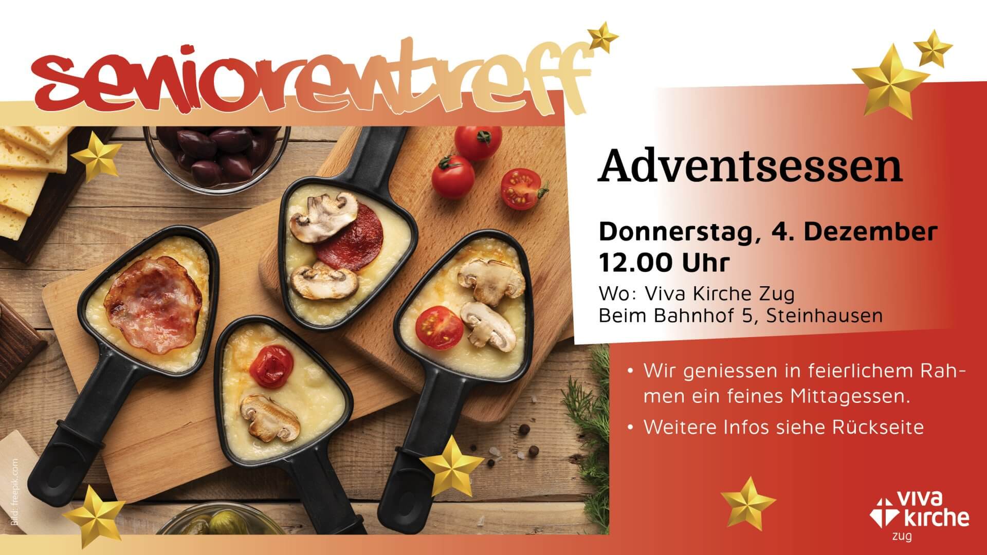 Im Advent geniessen wir – in feierlichem Rahmen – ein feines Raclette mit Zutaten. Du musst nichts mitbringen, ausser, du benötigst einen speziellen Käse. Falls du Raclette nicht magst, aber trotzdem teilnehmen möchtest, melde dich, damit wir gemeinsam eine Lösung finden. Natürlich darf auch ein Dessert nicht fehlen. Der Anlass ist kostenlos. Passend zum Advent…