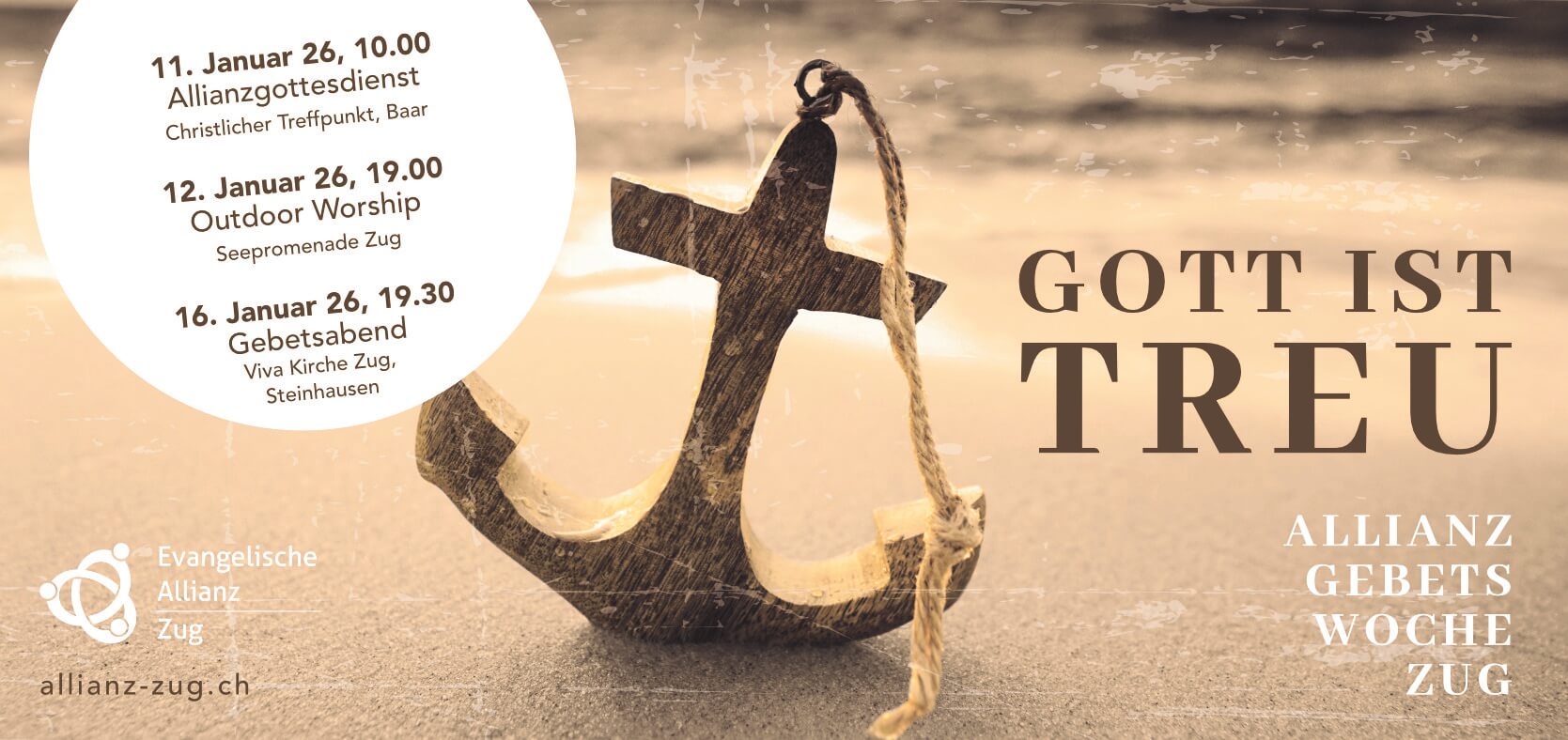 Wie könnten wir das frische Jahr besser beginnen als mit einer Gebetswoche? Als Evangelische Allianz Zug feiern und beten wir gemeinsam. Das Thema lautet “Gott ist treu”. Und so kannst du dich einklinken: – Sei am 11. Januar 26, 10 Uhr am Allianzgottesdienst im Christlichen Treffpunkt Baar (McDonalds) mit dabei. Es gibt auch ein Kinderprogramm.…