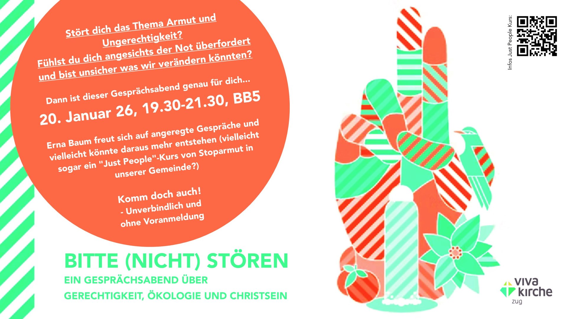 Stört dich das Thema Armut und Ungerechtigkeit? Fühlst du dich angesichts der Not überfordert und bist unsicher was wir verändern könnten? Dann ist dieser Gesprächsabend genau für dich. Erna Baum freut sich auf angeregte Gespräche und vielleicht könnte daraus mehr entstehen (vielleicht sogar ein “Just People”-Kurs von Stoparmut in der Viva Kirche Zug?) Komm doch…