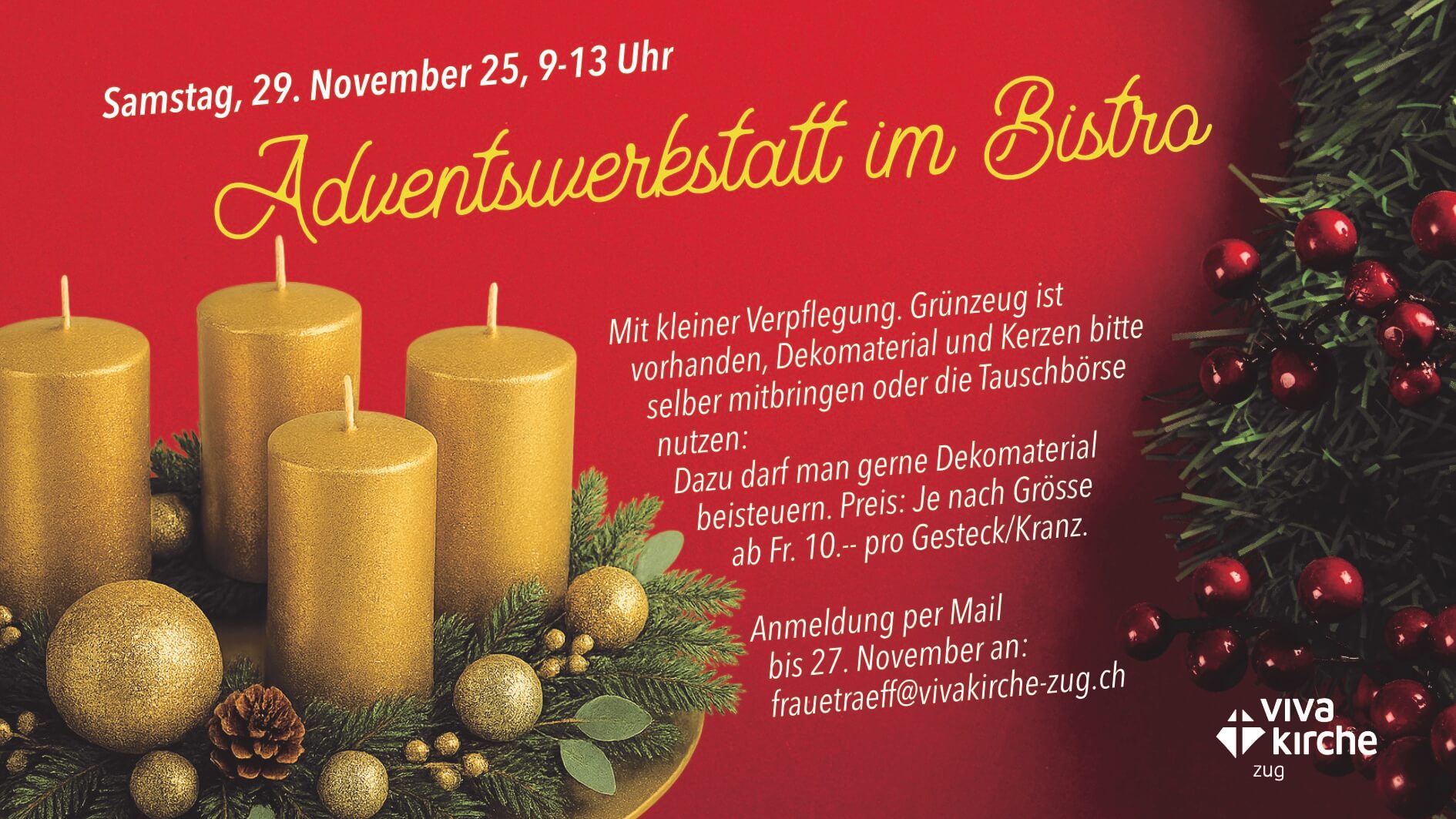 Mit kleiner Verpflegung. Grünzeug ist vorhanden, Dekomaterial und Kerzen bitte selber mitbringen oder die Tauschbörse nutzen: Dazu darf man gerne Dekomaterial beisteuern. Preis: Je nach Grösse ab CHF 10 pro Gesteck/Kranz Anmeldung per Mail bis 27. November an: frauetraeff@vivakirche-zug.ch